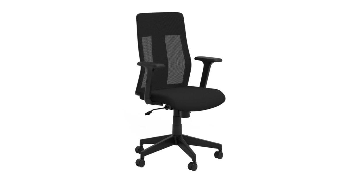 Cadira Mod. LOGOS, giratòria, rodes, gas, sistema sincro, respatller en malla negre i seient entapissat en roba negre.